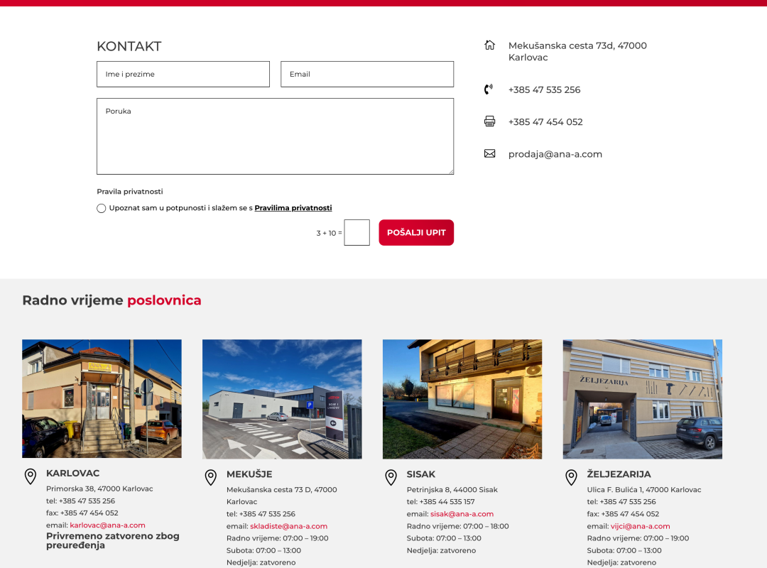 Implementirane su i standardne e-commerce funkcionalnosti — lista želja, korisnički račun, upravljanje narudžbama te besplatna dostava za narudžbe iznad minimalnog iznosa. Uz web shop, stranica jasno prikazuje informacije o fizičkim poslovnicama s radnim vremenima i kontaktima, što je važno za klijente koji preferiraju osobni kontakt ili preuzimanje robe na licu mjesta.